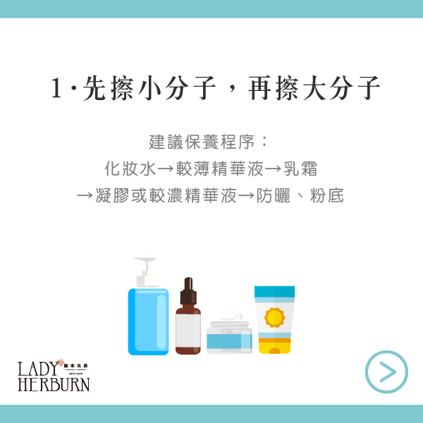 1. 保養品順序由水→油、分子小→大,