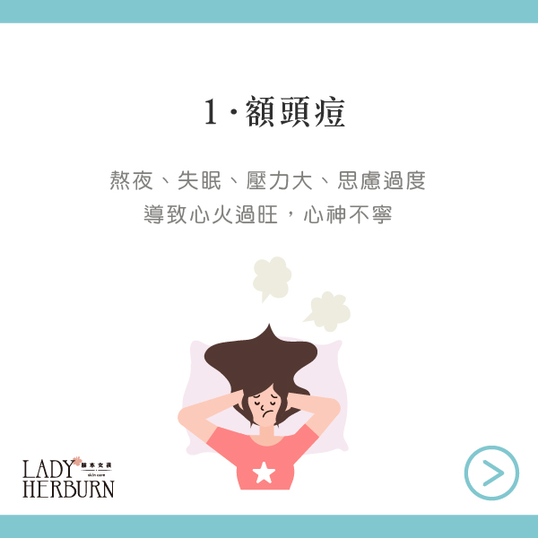 額頭:像是壓力大常熬夜失眠都是比較常見的原因。