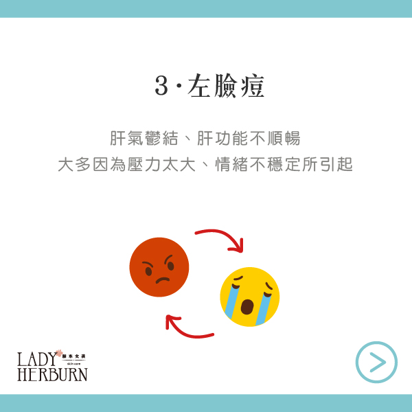 左邊臉頰:通常都是肝功能不順或壓力太大了。(壓力痘有時會亂長)
