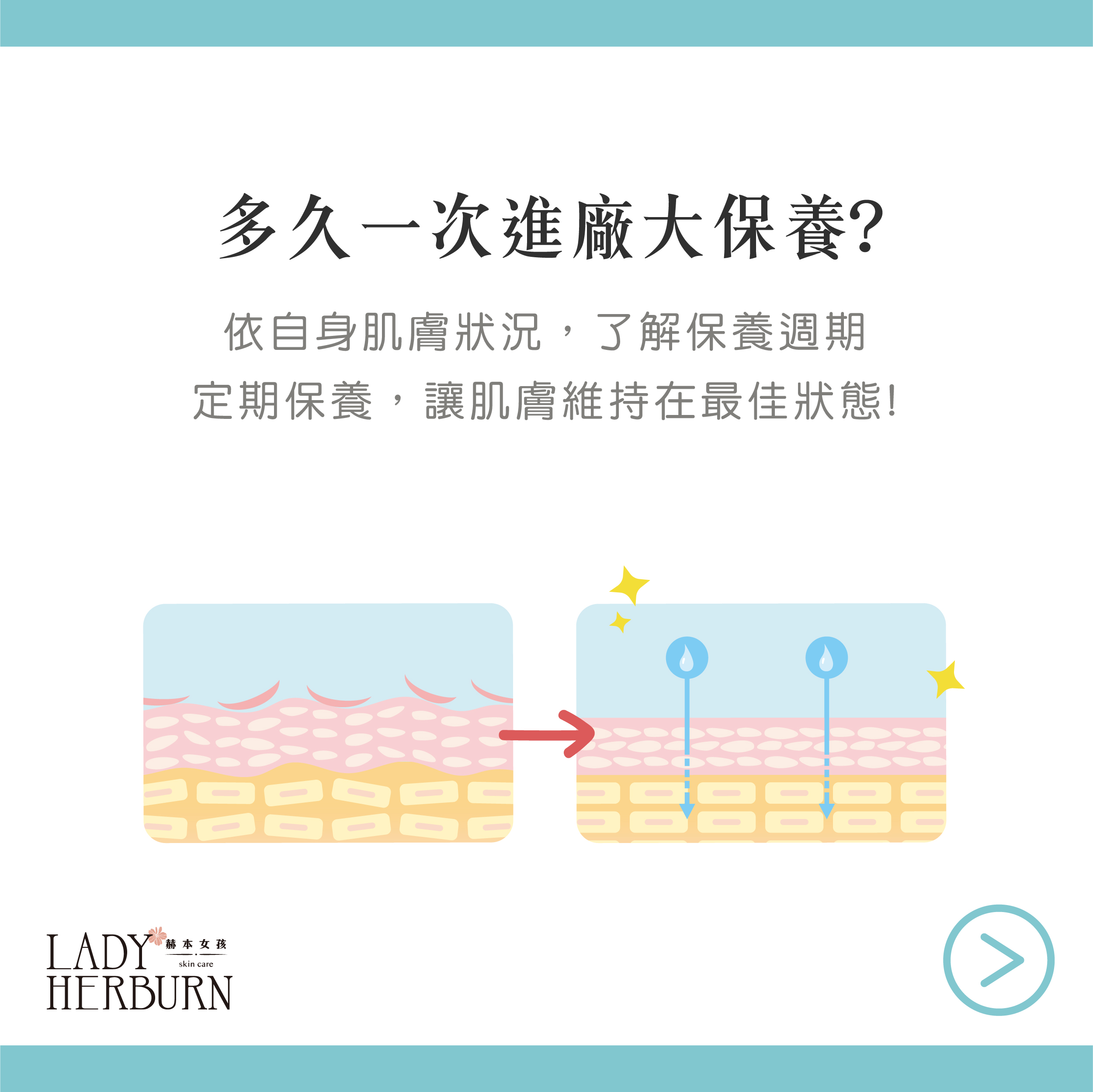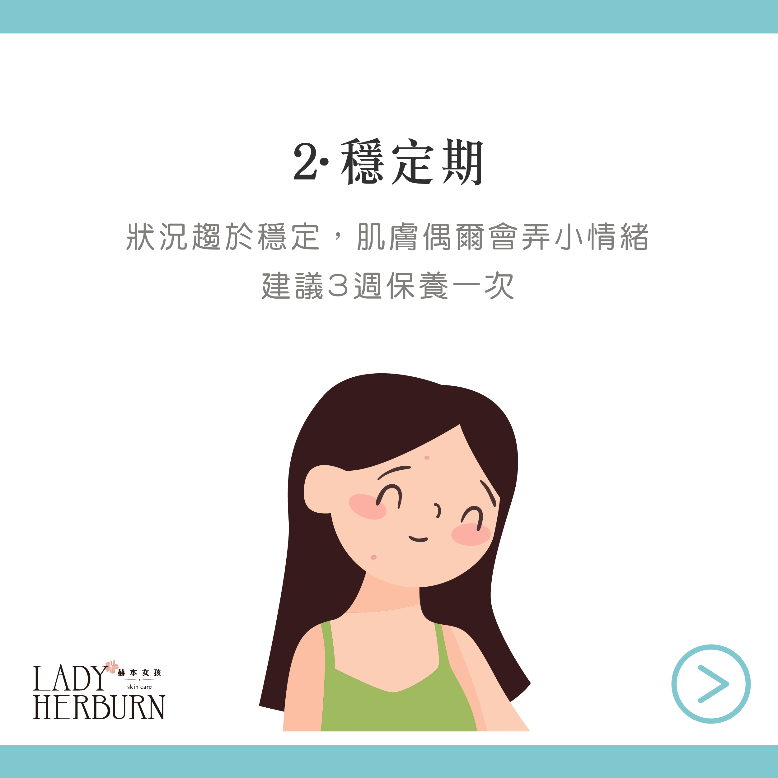 2- 穩定期 (3週一次):漸漸穩定後,偶爾肌膚才會鬧鬧小脾氣。